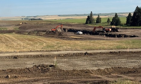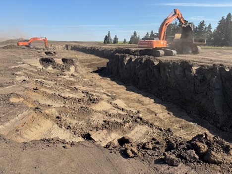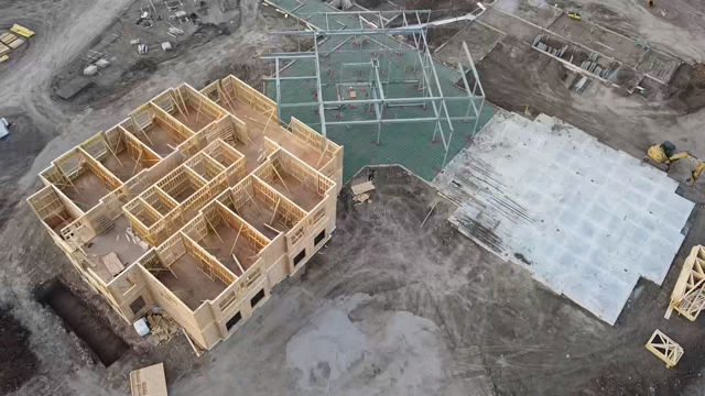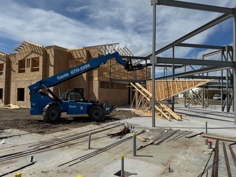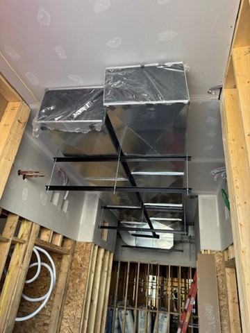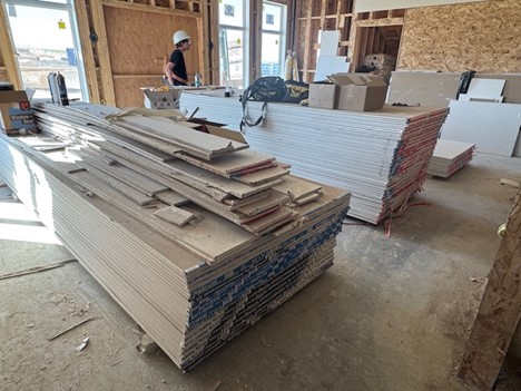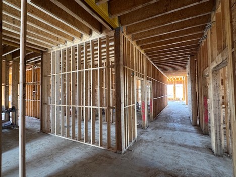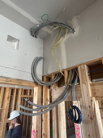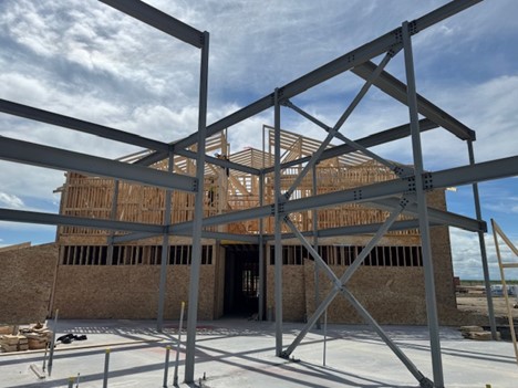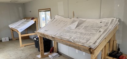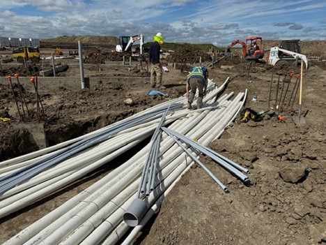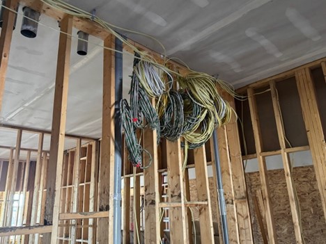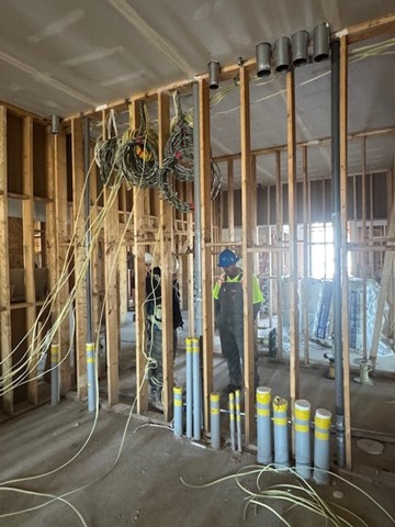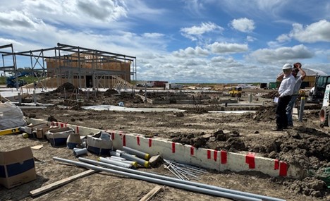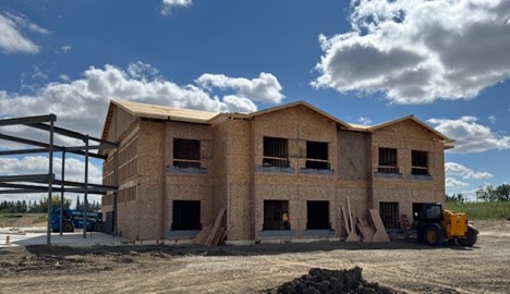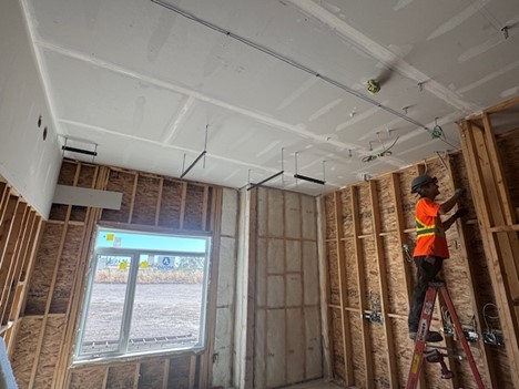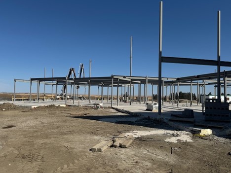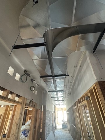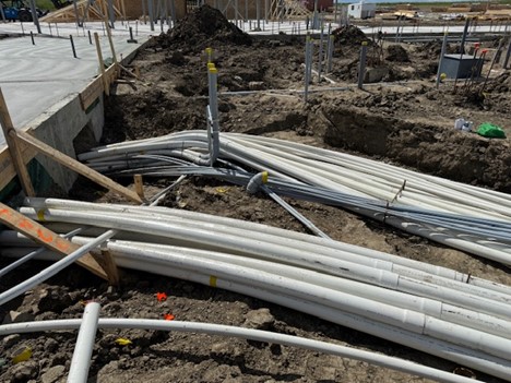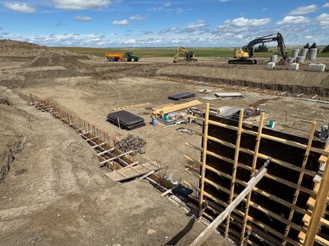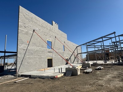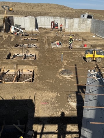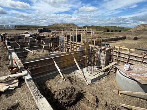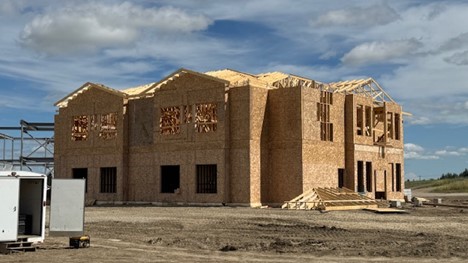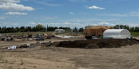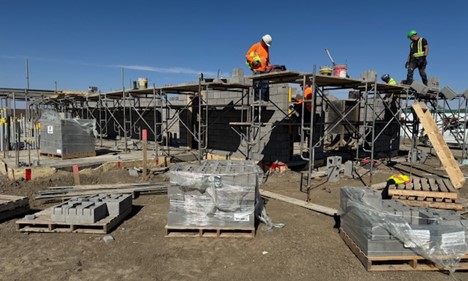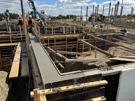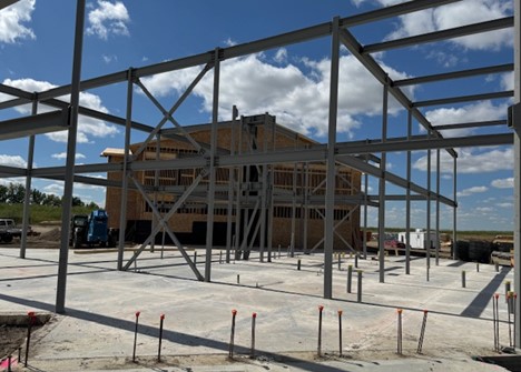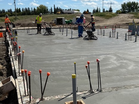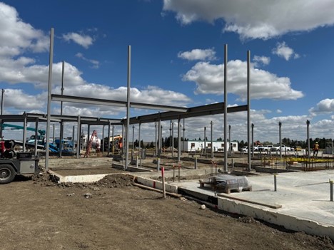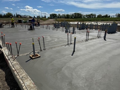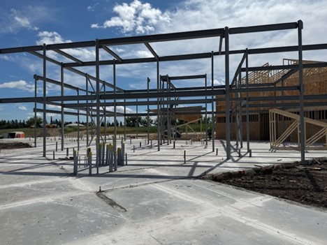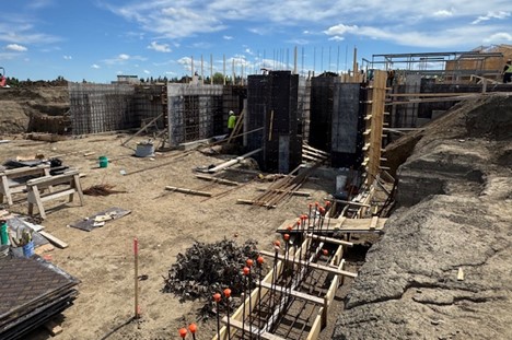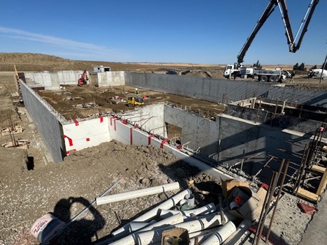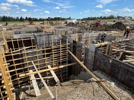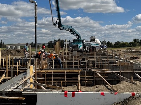 Trochu Housing Corporation Construction update: Progress is being made. Cinder block walls being erected on Phase 4 (Mechanical wing). Cinder block firewall between Phase 3 and Phase 5 main areas. Phase 1 HVAC ducts, plumbing, electrical, and hanging drywall ongoing. Lots of wire, pipe, and ducts will be hidden behind walls and ceilings. Steel beams and posts in Phase 5. Concrete floor poured on Phase 5. Foundation concrete walls poured for parkade of Phase 6. Storm sewer manholes and structural footings are being added to parkade floor.