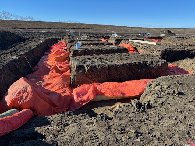 Trochu Senior Housing construction update: Foundation walls are being poured. Will continue throughout the week. More trenches being dug for Phase 2 footings. Placing heated lines for thawing ground for Phase 3