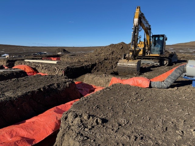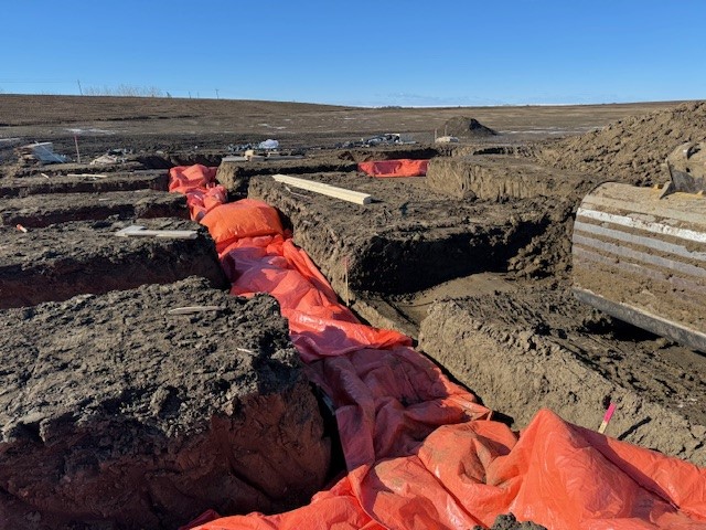 Trochu Seniors Housing Construction update: Trenches are being excavated to prep for pouring concrete foundation. Heat is pumped under the tarps to thaw ground frost. Some concrete forms are in place.